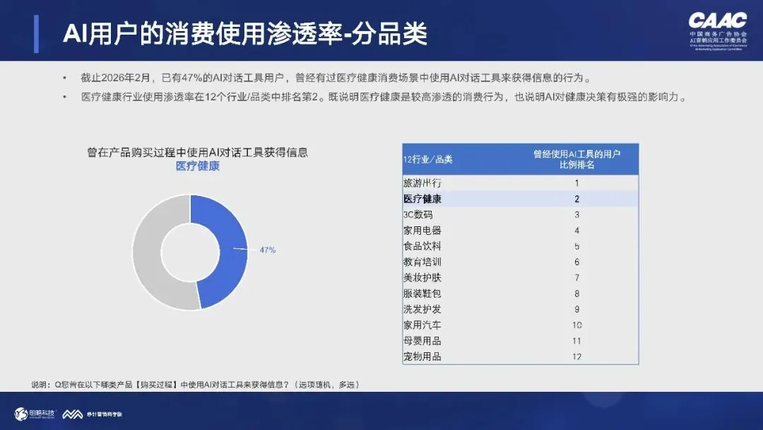 调研显示,AI 对话工具已经深度渗透到医疗健康消费决策的各个环节。有 47% 的人曾经在购买医疗健康产品时使用 AI 获取信息。这个比例在 12 个被调研的消费行业中排名第二,仅次于旅游出行。