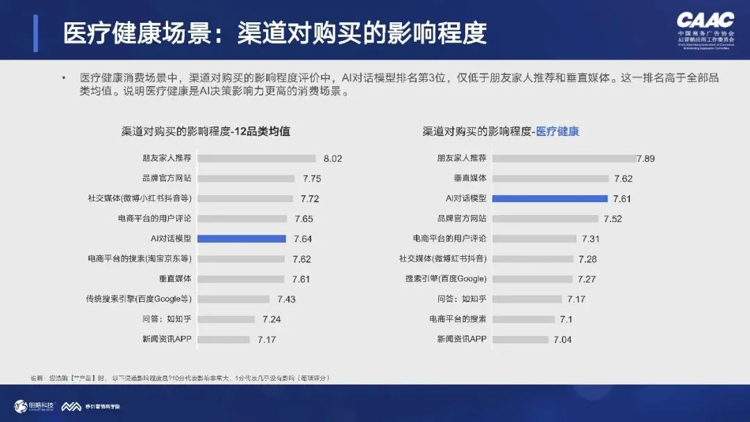 在影响医疗健康购买决策的所有渠道中,AI 对话模型排在第三位。只有朋友家人推荐和垂直媒体的影响力超过了它。这个排名高于 12 个品类的平均水平,说明医疗健康是 AI 决策影响力特别突出的一个领域。传统上人们依赖的电商平台用户评论、社交媒体内容、品牌官方网站等渠道,在医疗健康领域的影响力都已经落在了 AI 后面。