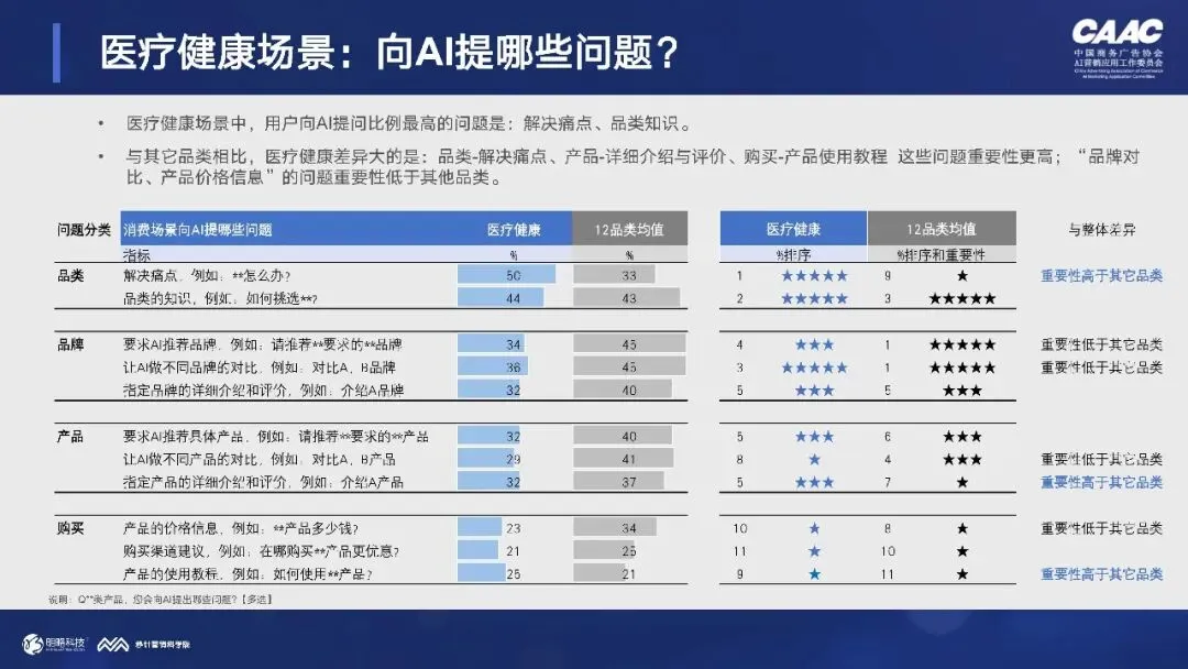 用户在医疗健康场景下向 AI 提问的内容也有明显特点。解决痛点和了解品类知识是最常见的两类问题。和其他品类相比,用户更关心产品的详细介绍和评价,以及使用教程。而品牌对比和产品价格信息的重要性则低于其他品类。在医疗健康消费中,用户更看重产品本身的功效和使用方法,而不是单纯比较不同品牌的优劣或者价格高低。