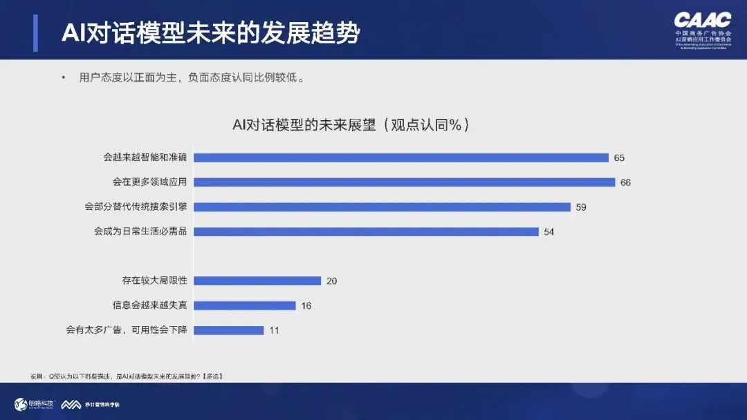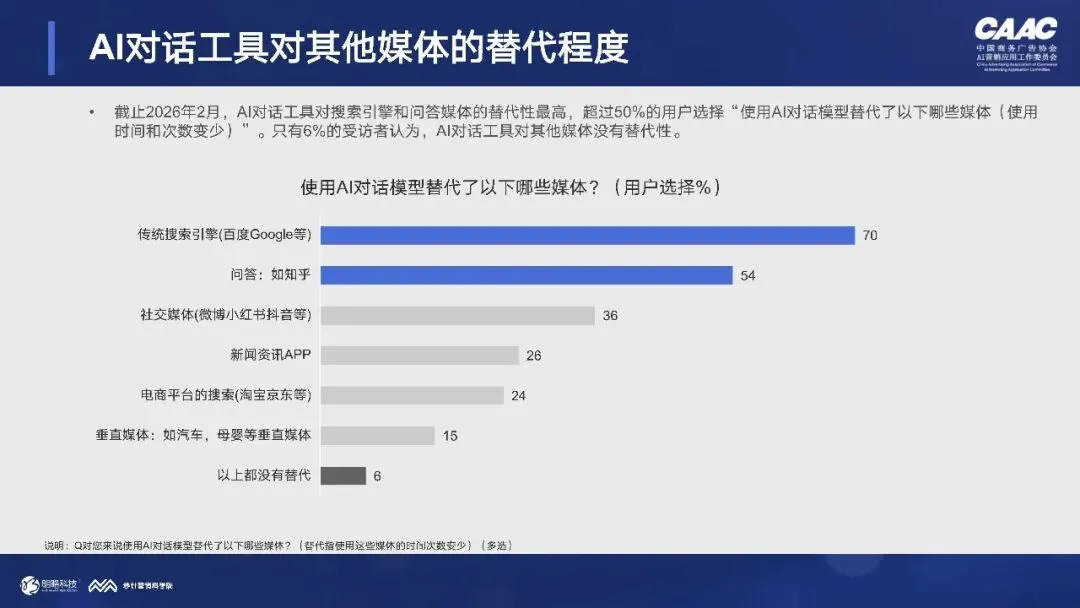 AI 对话工具正在逐渐替代传统的信息获取渠道。有 70% 的用户表示,使用 AI 后,他们使用传统搜索引擎的时间和次数变少了。还有 54% 的用户减少了对问答平台的使用。只有 6% 的用户认为 AI 没有替代任何其他媒体。这种替代效应在医疗健康领域表现得特别明显,因为这里的信息需求往往更加明确和具体,AI 能够快速给出结构化的答案。