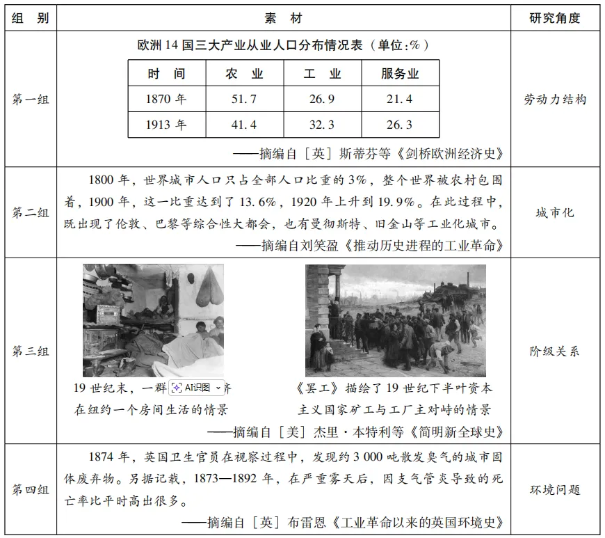 研究思路:从组内搜集的素材看,自1870年至1913年,欧洲14 国的工业和服务业从业人口比重上升,农业从业人口比重下降。结合相关知识并深入分析可发现,随着第二次工业革命的扩展,出现了电力、汽车等新兴工业,越来越多的人从事工业和服务业。