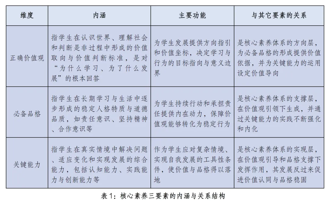 从结构逻辑来看,核心素养并非零散能力的简单叠加,而是一个具有内在关联、相互支撑的有机整体系统。其中,正确价值观是学生认识世界、理解社会、判断是非过程中形成的价值取向与价值判断标准,是对 “为什么学习、为了什么发展” 这一根本问题的回答,为学生的终身发展提供方向指引与价值坐标,决定了学习与行为的目标指向与意义边界,是核心素养体系的方向层,为必备品格的形成提供价值依据,为关键能力的运用设定价值导向。必备品格是学生在长期学习与生活中逐步形成的稳定人格特质与道德品质,包括责任意识、坚持精神、合作意识等核心内涵,为学生的持续行动和责任承担提供内在动力,保障价值观能够转化为稳定的行为实践,是核心素养体系的支撑层,在价值观引领下生成,并通过关键能力的实践不断强化与内化。关键能力是学生在真实情境中解决问题、适应变化、实现发展的综合能力,包括认知能力、实践能力与创新能力等核心维度,是学生应对复杂情境、实现自我发展的工具性条件,使价值引领与品格塑造能够落地为具体实践,是核心素养体系的实现层,在价值观引导和品格支撑下发挥作用,其发展反过来也会促进价值认同的深化与品格素养的稳固。