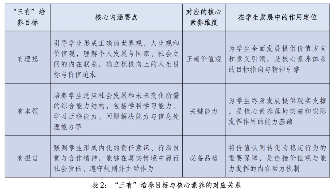 “有理想、有本领、有担当” 的 “三有” 培养目标,是新时代我国人才培养的总体目标,其核心内涵与核心素养体系之间存在清晰、稳定、深度契合的对应关系,为核心素养从理念向实践转化提供了明确的实施路径。