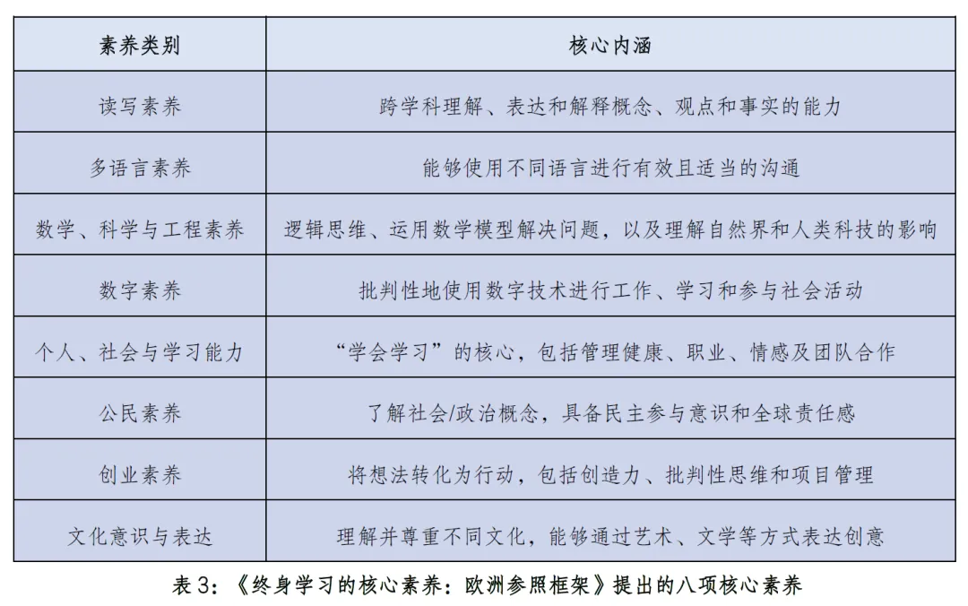 欧盟层面,2006 年欧盟发布《终身学习的核心素养:欧洲参照框架》,成为欧盟教育与培训政策的核心框架,并于 2018 年完成重大修订,以帮助欧盟公民更好地应对数字化转型与多变社会带来的挑战。在欧盟的框架体系中,核心素养被定义为知识、技能与态度的综合体,是每个人实现个人发展、增强就业能力、促进社会融入和积极行使公民权利所必备的核心能力,具体包括读写素养、多语言素养、数学科学与工程素养、数字素养、个人社会与学习能力、公民素养、创业素养、文化意识与表达八项基本素养,突出了终身学习、数字化适应、社会参与与创新创造的核心导向。