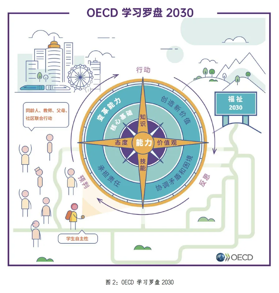 世界经济合作与发展组织层面,2019 年 OECD 正式发布《OECD 学习罗盘 2030》,作为其 “教育 2030:未来的教育与技能” 项目的核心成果,核心回答了 “今天的学生需要什么样的知识、技能、态度与价值观,才能在 2030 年及以后的世界中茁壮成长并塑造未来” 的根本问题。该框架将学习体系比作罗盘,强调帮助学生利用知识、技能、态度与价值观,在陌生、复杂和不确定的未来环境中形成自主导航的能力。框架将核心能力分为知识、技能、态度与价值观三大维度,其中知识包括学科知识、跨学科知识、认知知识与程序知识;技能包括认知与元认知技能、社会与情感技能、身体与实践技能;态度与价值观则覆盖个人、地方、社会、人类四个层面。同时,该框架明确提出了面向未来的三大变革能力,即创造新价值、协调矛盾和困境、承担责任,为全球未来教育发展提供了共同的语言与方向。其核心启示在于,教育系统需要实现深层转型,教学方式从教师单向讲授转向引导学生自主探究,课程设计注重跨学科整合与真实问题解决,教育评价关注高阶思维、合作与反思等素养的发展过程,这与我国核心素养导向的教育改革方向高度契合。