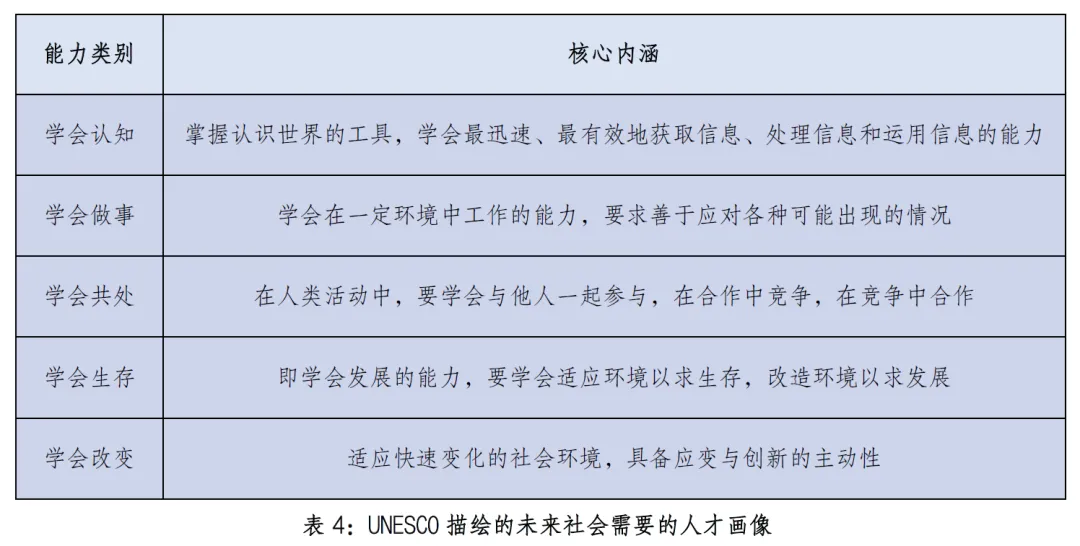 联合国教科文组织作为全球教育领域的最高指导机构,自成立以来每隔约 25 年发布一份关于教育的全球纲领性报告,引领全球教育变革方向。1996 年,UNESCO 发布《学习:内在的财富》,提出了 21 世纪公民必备的终身学习四大支柱,即学会认知、学会做事、学会共处、学会生存,2003 年补充了学会改变维度,形成了核心素养的五大维度,为全球核心素养体系的构建奠定了重要的理论基础。2021 年 11 月,UNESCO 发布《一起重新构想我们的未来:为教育打造新的社会契约》,从哲学高度描绘了未来社会需要的人才画像,核心概括为认知与整合的能力、同理心与协作的能力、行动与变革的能力,进一步凸显了面向未来的素养培育核心方向。