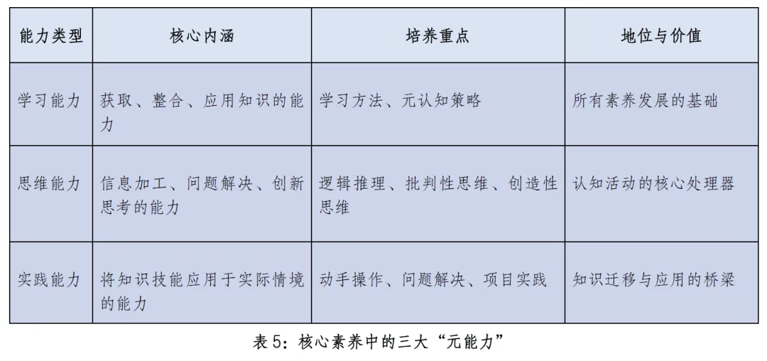 在核心素养的关键能力体系中,学习能力、思维能力、实践能力是支撑所有素养持续发展的三大 “元能力”,具有基础性、统摄性地位,是其他能力形成与发展的核心底层支撑。