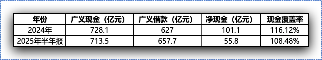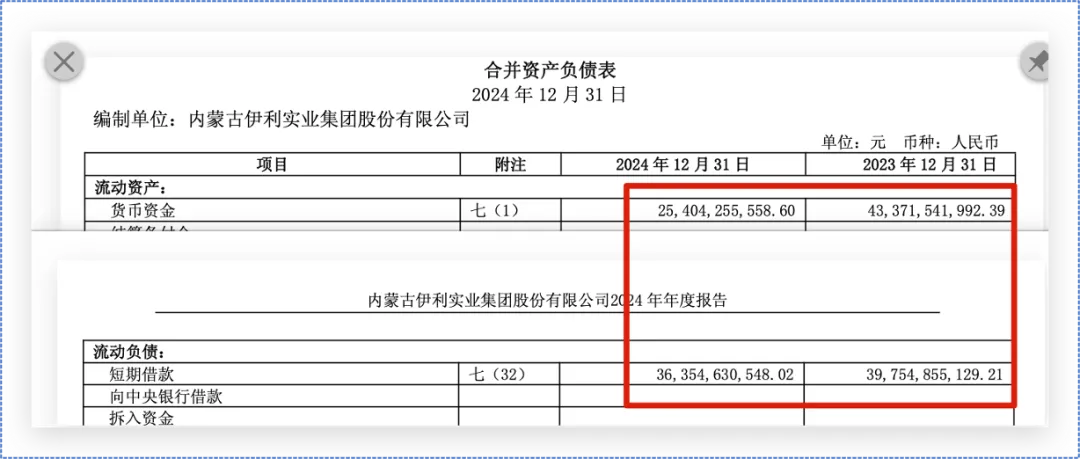 在伊利股份资产负债表里,货币现金远小于短期借款(见下图),2024年年报披露,货币资产是254亿元,短期借款362亿元,货币资产仅覆盖短期借款的70%,不得不引起重视。