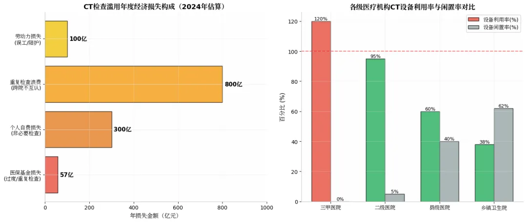 间接社会成本:劳动力损失:不必要检查导致的误工、陪护成本,2024年约100亿元 ;机会成本:过度投入CT设备挤占了基层医疗与预防保健资源,估计机会成本达300亿元/年。