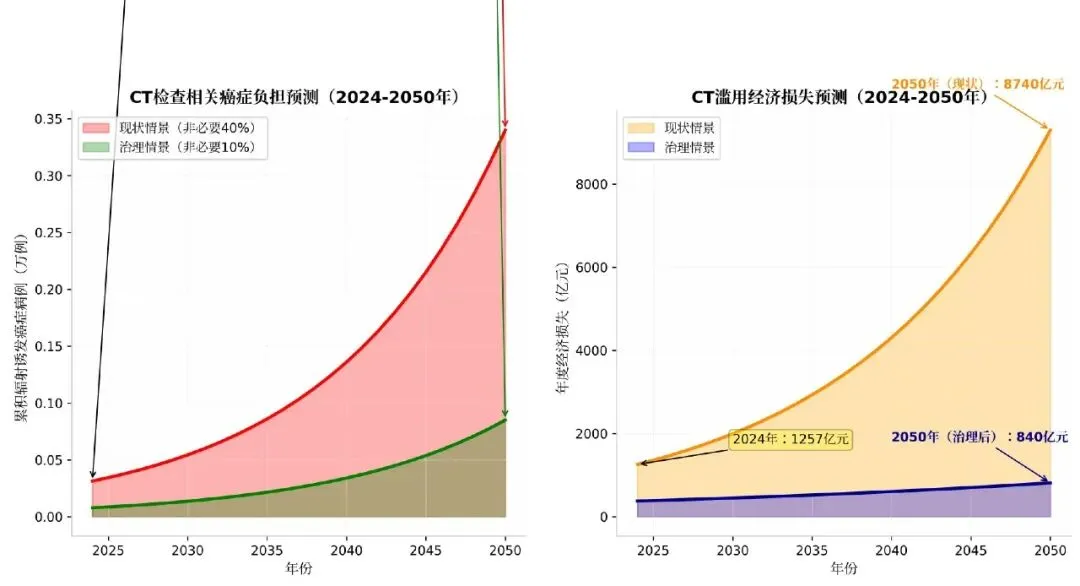 预测结果: 2024年现状:非必要CT检查导致约5.7万例辐射诱发癌症(占新发癌症的1.8%);2050年现状情景:若不加干预,年诱发癌症病例将达12.8万(按年增长9.6%计算,则为5.7*