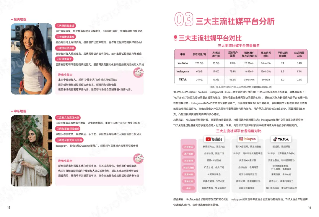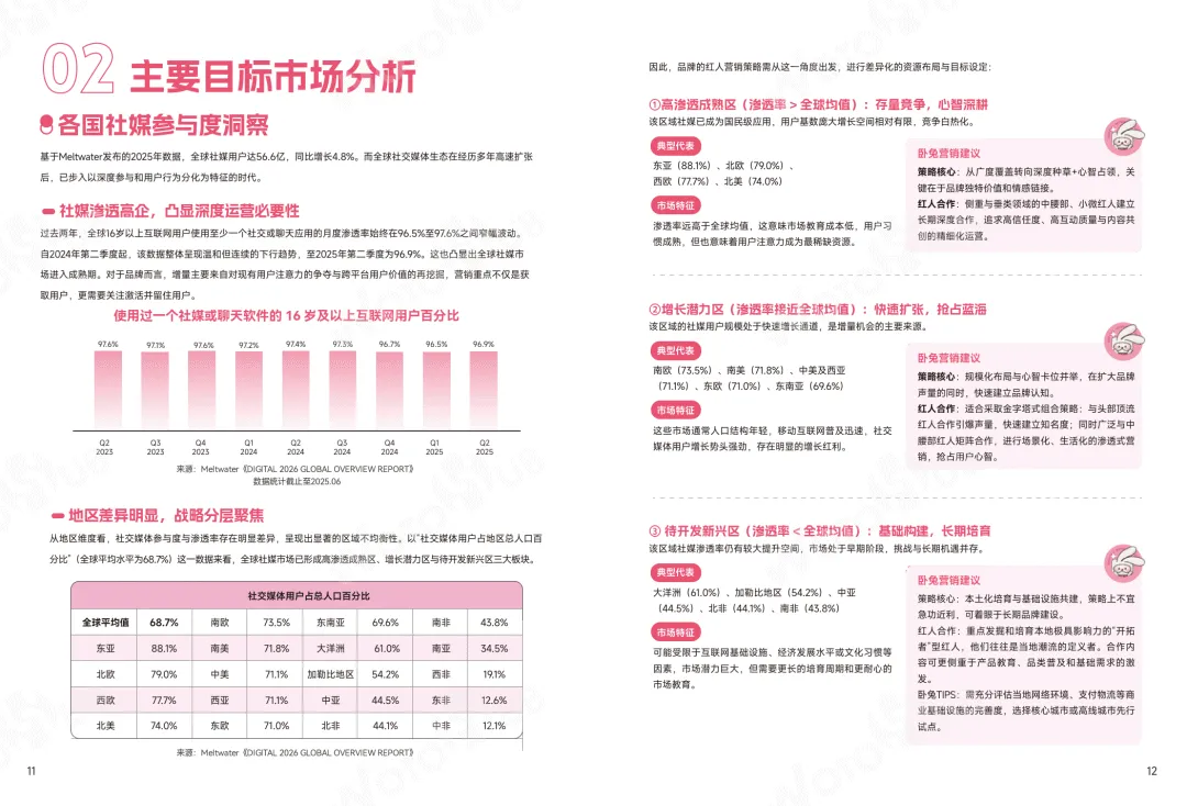 当前全球红人营销市场规模持续高速增长,2025 年达325.5 亿美元,社媒用户渗透率升至 69%,YouTube、Instagram、TikTok 为三大核心平台,用户粘性与商业价值突出。全球社媒市场分化为高渗透成熟区、增长潜力区、待开发新兴区,欧美、东南亚、日韩仍是品牌布局重点,不同区域在红人业态、消费习惯、合规要求上差异显著。