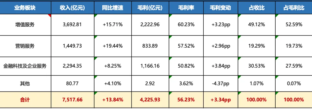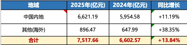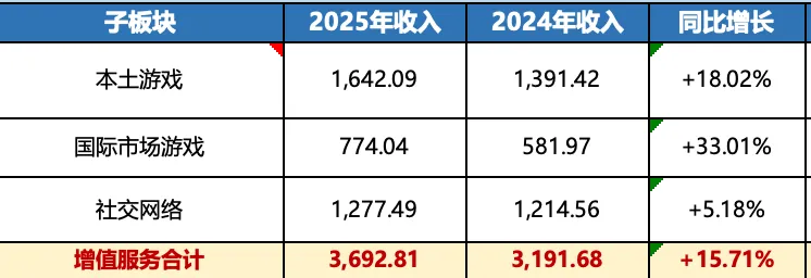 各业态经营情况:增值服务 :3692亿,同比+15.7%,营收占比:49%。游戏:受益于长青游戏的持续增长及内容内容驱动游戏的快速扩张,国际游戏市场游戏年收入突破 100 亿美元。其中本土游戏1642亿,同比+18%(三角洲行动新游爆发 + 王者荣耀/和平精英长青);国际游戏774亿,同比 +33%(Supercell+PUBG MOBILE+鸣潮)。社交网络:1277亿,同比+5%,AI 加速游戏的内容制作,改善了用户体验,提升了营销效益。提高了广告基础模型,取得高于同行业的收入增长。视频号总用户使用时长同比超过 20%。营销服务 :营收1449.73亿,同比+19.44%),营收占比:19%,最快增速。年报指出"AI驱动的广告精准定向"和"广告主使用AI制作更多广告"是单价提升的关键。这意味着AI不仅没有威胁到腾讯的广告业务,反而成为了放大器。金融科技及企业服务 :2025年营收2294.35亿,同比+8.25%,营收占比:31%。金融科技 ,高个位数增长,理财服务收入增加,商业支付活动随消费复苏而增长。企业服务,接近 +20%,国内及海外云服务需求增加,微信小店交易额上升带动商家技术服务费收入增长。中国内地收入6621 亿 同比+11%,占总收入88%,增值服务+广告+支付均以国内为主。海外同比+33%,增速远超国内,主要由国际游戏(+33%)拉动。