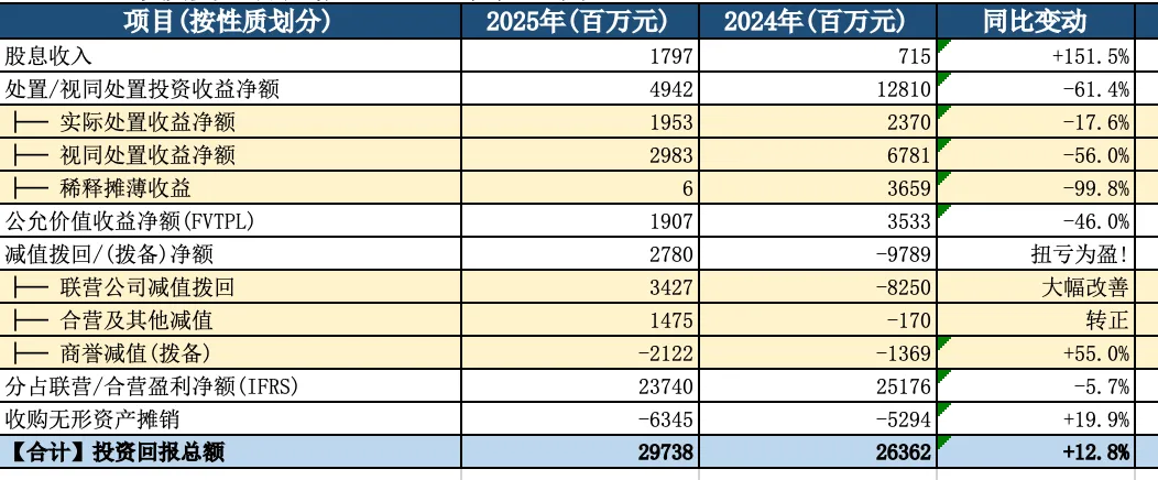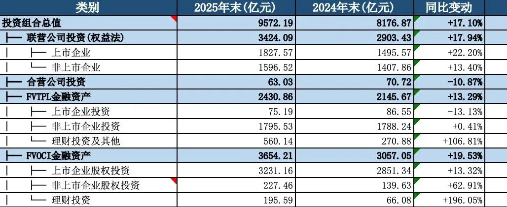 2025 年投资组合人民币 9572.19 亿 ,上市公司:6727 亿,非上市公司 3631 亿。投资回报 297 亿。2024 年投资组合人民币 8176.87 亿,上市公司:5698 亿 ,非上市公司 3356 亿。