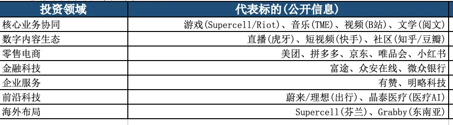 投资策略加强在核心业务的领先地位,补充"连接"策略(社交/数字内容、零售、金融科技)重点领域:医疗、云及AI、交通等行业。