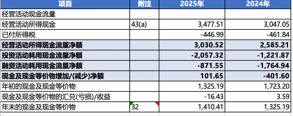 • 回购 + 股息合计:1,132亿,经营活动现金流金额 3030 亿,现金流极为充裕。
