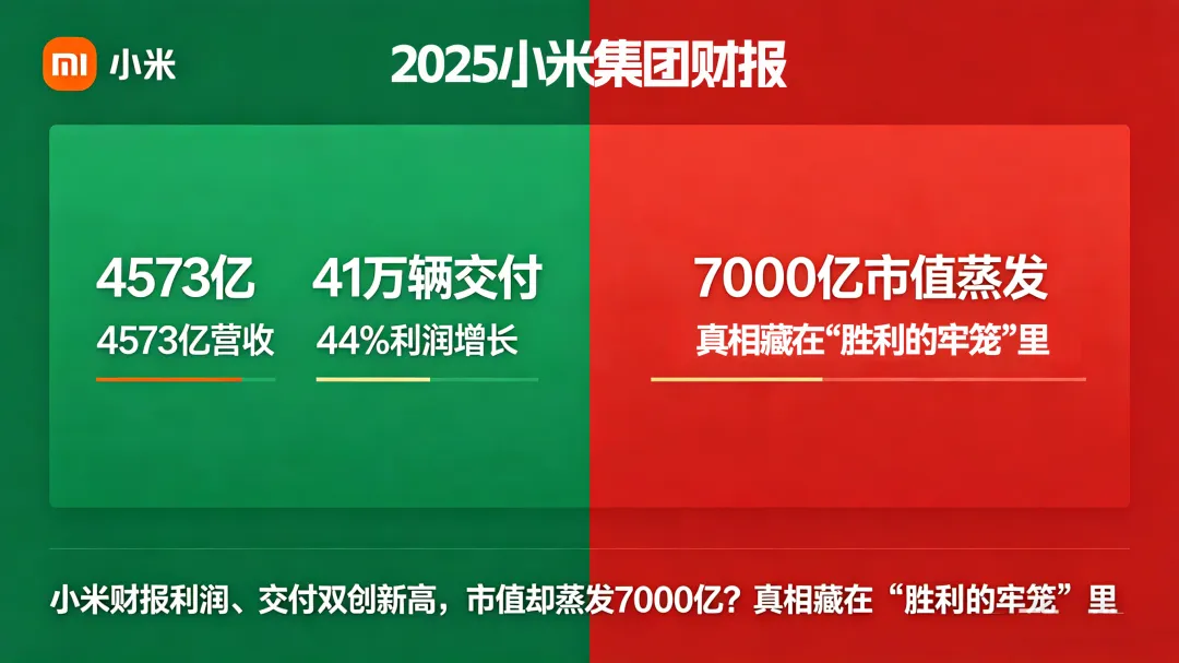 真相藏在“胜利的牢笼”里,这是一个让所有投资者都困惑的商业悖论:小米交出了史上最强财报——2025年总收入4573亿元,经调整净利润392亿元,同比暴涨43.8%,毛利润首次突破千亿;汽车交付41万辆,远超年初目标,营收达1061亿元,占总营收23%,从宣布造车到量产不到3年,17个月就实现季度盈利,速度比特斯拉还快;手机稳居全球前三,IoT设备连接数突破10.79亿台,互联网服务收入持续创新高。可就是这样一串足以载入科技史的成绩单,换来的却是资本市场的“用脚投票”:从2025年6月市值峰值1.55万亿港元,到如今不足8000亿港元,不到10个月,7000亿港元市值凭空蒸发,股价近乎腰斩。一边是利润、交付的双重巅峰,一边是市值的断崖式下跌;一边是跨界造车的工业奇迹,一边是资本市场的冷水浇头。小米到底经历了什么?为什么越赢越“输”?其实答案很残酷:那些让小米站上巅峰的核心优势,恰恰是困住它的牢笼;每一次胜利,都是在给自己的枷锁再加固一圈。这不是偶然的市场波动,而是小米增长模型里,早已注定的必然结局。先看高光时刻:小米凭什么创造“跨界奇迹”?