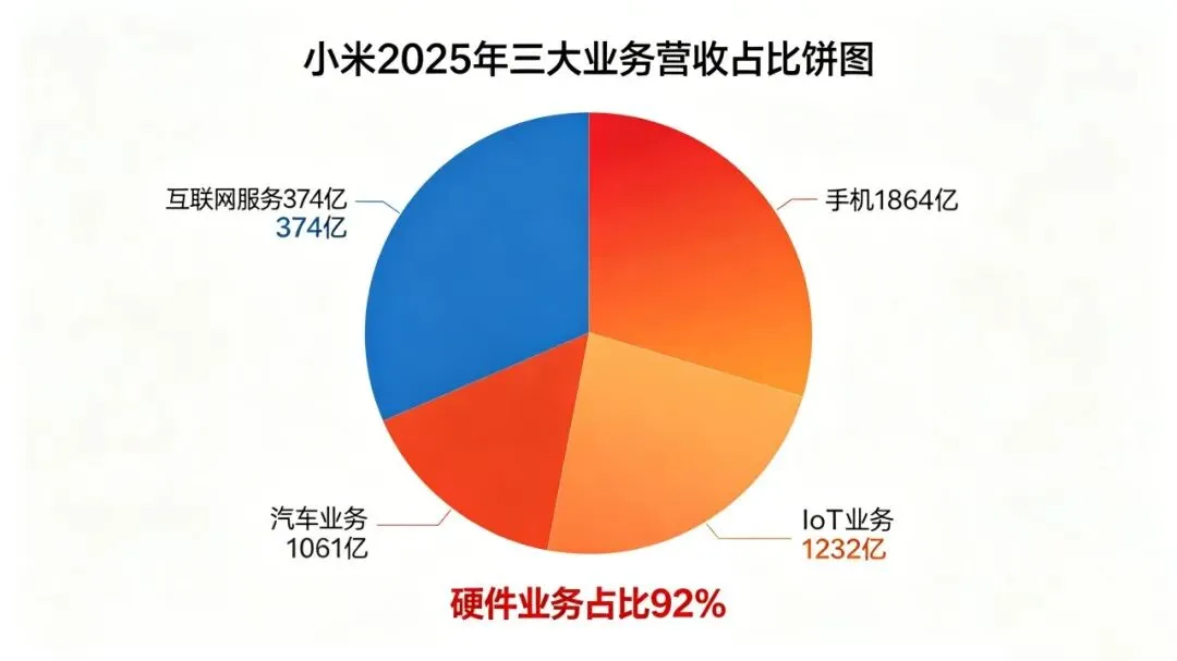 小米多年来一直强调自己是“科技生态公司”,希望资本市场用“科技平台公司”的标准给它估值——就像微软、苹果那样,靠“卖杠杆”赚钱:一次研发,持续盈利,成本几乎不增加,这才是高估值的核心逻辑。但现实是,小米92%的收入都来自硬件销售,本质上还是一家“靠卖时间赚辛苦钱”的公司:每赚一块钱,就要投入一块钱的成本,收入和成本呈平行线,效率再高也有极限。拆开小米4573亿的营收就会发现:手机1864亿、IoT 1232亿、汽车1061亿,而真正能产生杠杆效应的互联网服务,仅374亿,占比不足8%。2025年年中,市场之所以愿意给小米1.55万亿港元的市值,是因为相信“人、车、家”生态闭环形成后,互联网服务收入会大幅提升,小米会从“硬件公司”转型为“平台公司”。但最终,汽车业务的爆发不仅没有让小米“变轻”,反而让硬件占比更高,彻底打破了市场的期待。于是,资本市场只能将小米的估值,从“科技平台”切换为“硬件制造”——同样的利润,用制造公司的标准来衡量,估值直接腰斩。如今小米8000亿港元市值、17倍PE,对于一家核心毛利率随时可能被上游改写的制造企业来说,甚至不算便宜。中局大考:小米的破局之路,到底在何方?