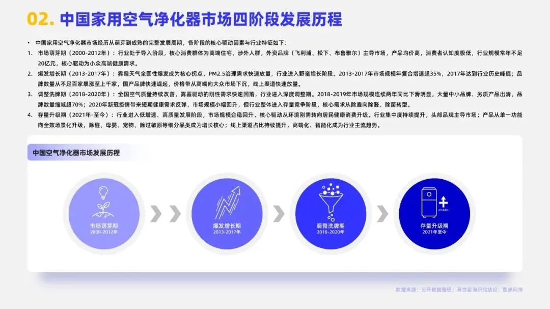 1、市场萌芽期(2000-2012年):行业处于导入阶段,核心消费群体为高端住宅、涉外人群,外资品牌(飞利浦、松下、布鲁雅尔)主导市场,产品均价高,消费者认知度极低,行业规模常年不足20亿元,核心驱动为小众高端健康需求。