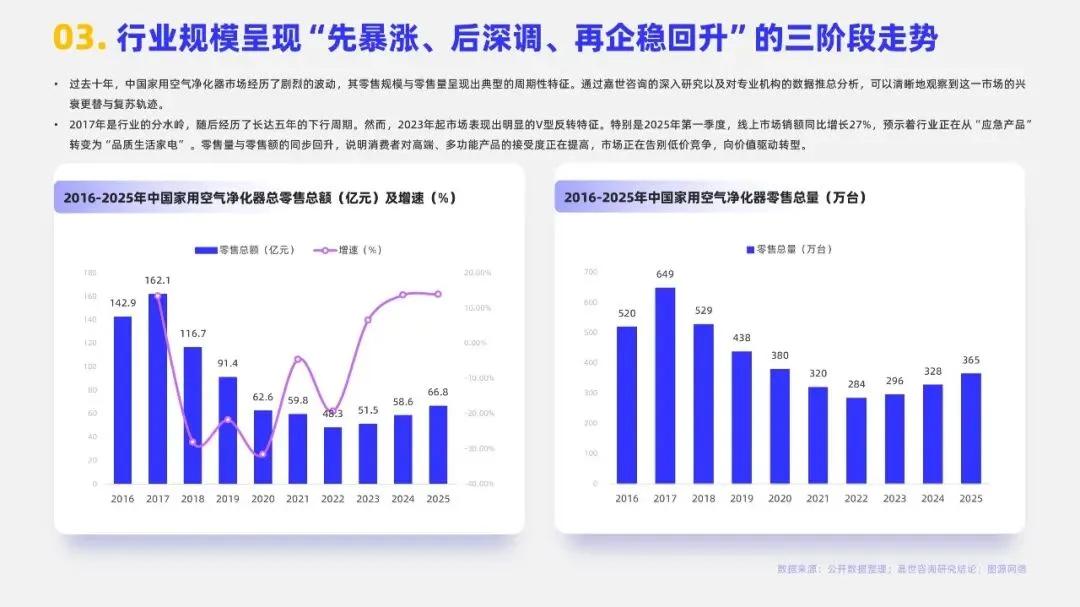2023-2025年,随着居民健康消费意识的提升,健康需求升级与政策利好催化市场回暖,市场需求从单一的“除霾”转向除醛、除菌、除过敏原及宠物场景等精细化治理,成为行业复苏的核心支撑。此外,新国标的实施加速了劣质产品的出清,头部品牌通过技术升级带动了均价回升。叠加国家“以旧换新”政策的落地,存量市场的更新需求被有效激活,推动了行业规模的企稳与反弹。