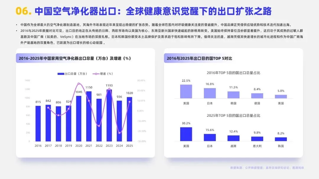 2016与2025年数据对比可见,出口目的地正在从传统的日韩、西欧市场向以美国为核心、东南亚新兴国家快速崛起的新格局转变。美国始终保持首位且份额显著提升,这归功于其成熟的过敏人群基数及中国厂商(如美的、VeSync)在当地市场的深度扎根。日本和韩国份额受本土品牌保护及需求趋于饱和影响有所下滑。值得关注的是,越南凭借其快速增长的城市化进程和作为中国厂商海外产能基地的双重角色,已跃居为出口增长的核心动能国 。