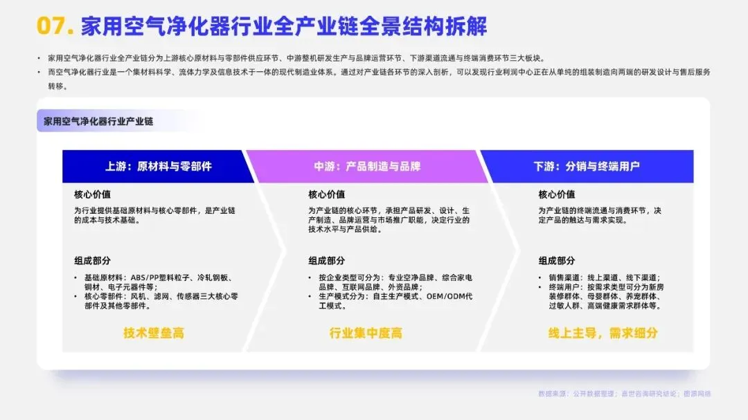 而空气净化器行业是一个集材料科学、流体力学及信息技术于一体的现代制造业体系。通过对产业链各环节的深入剖析,可以发现行业利润中心正在从单纯的组装制造向两端的研发设计与售后服务转移。