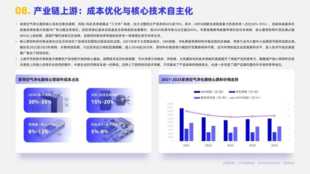 家用空气净化器的核心成本主要由滤网、风机/电机及传感器这“三大件”构成,合计占整机生产成本的60%至70%。其中,HEPA或复合滤网是最大的成本项(占比30%-35%),目前由具备多功能复合研发能力的国内厂商占据主导地位。风机领域已基本实现直流无刷电机的全面替代,到2025年其市场占比已超过95%。尽管高精度传感器市场仍由日本神荣、瑞士盛思锐等外资品牌占据80%以上的份额,但国产替代进程正在加快,且能同时检测多种指标的多合一传感器已成为市场主流。