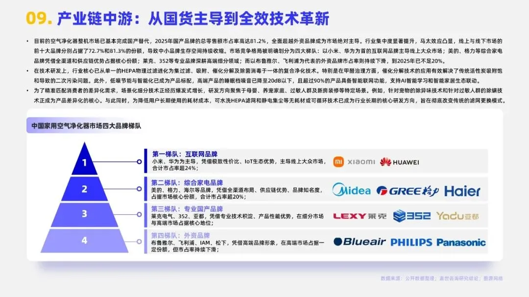 目前的空气净化器整机市场已基本完成国产替代,2025年国产品牌的总零售额市占率高达81.2%,全面超越外资品牌成为市场绝对主导。行业集中度显著提升,马太效应凸显,线上与线下市场的前十大品牌分别占据了72.7%和81.3%的份额,导致中小品牌生存空间持续收缩。市场竞争格局被明确划分为四大梯队:以小米、华为为首的互联网品牌主导线上大众市场;美的、格力等综合家电品牌凭借全渠道和供应链优势占据核心份额;莱克、352等专业品牌深耕高端细分领域;而以布鲁雅尔、飞利浦为代表的外资品牌市占率则持续下滑,到2025年已不足20%。