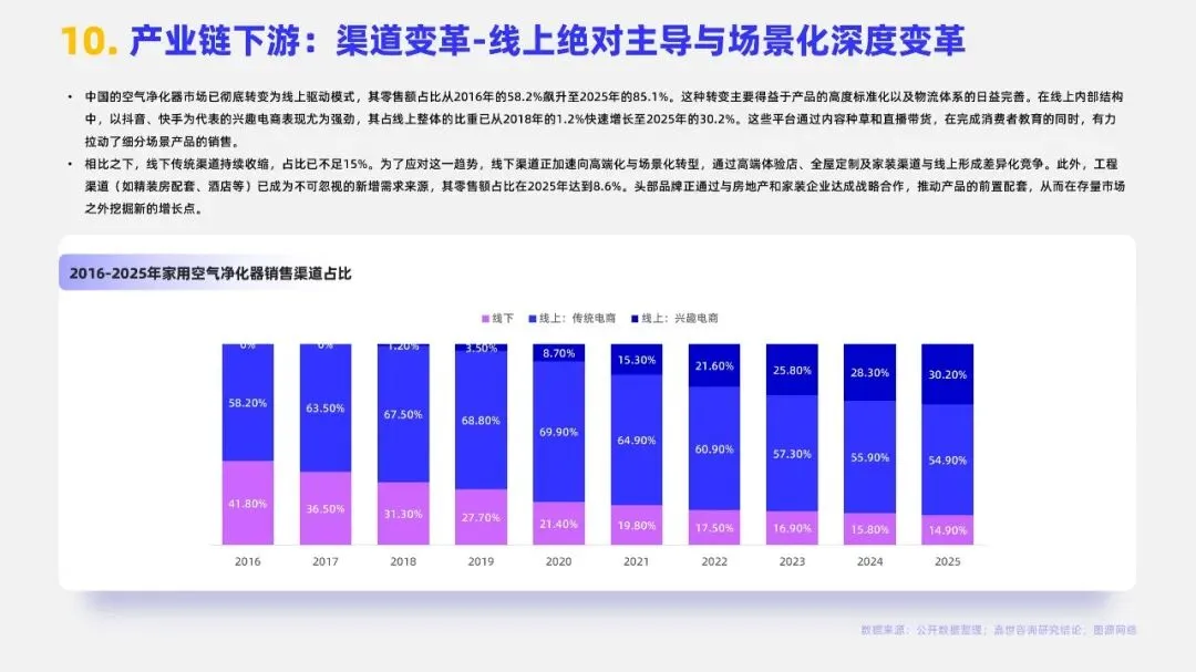 目前,市场已基本完成国产替代,国产品牌市占率超过80%,并在4000元以上的高端市场取得主导权 。产业链上游正致力于核心零部件的自主化,中游则聚焦于催化分解与智能联动等全效技术革新 。渠道方面,线上零售额占比已突破85%,以抖音为代表的兴趣电商成为细分场景产品增长的新动能 。