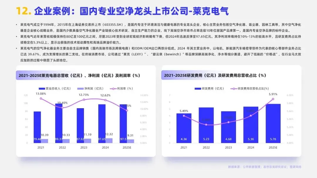 莱克电气成立于1994年,2015年在上海证券交易所上市(603355.SH),是国内专注于环境清洁与健康电器的专业龙头企业,核心主营业务包括空气净化器、吸尘器、园林工具等,其中空气净化器是企业核心战略业务,是国内少数具备空气净化器全产业链核心技术研发、自主生产能力的企业,线下高端空净市场市占率连续10年位居国产品牌第一,是国内专业空净品牌的标杆企业。