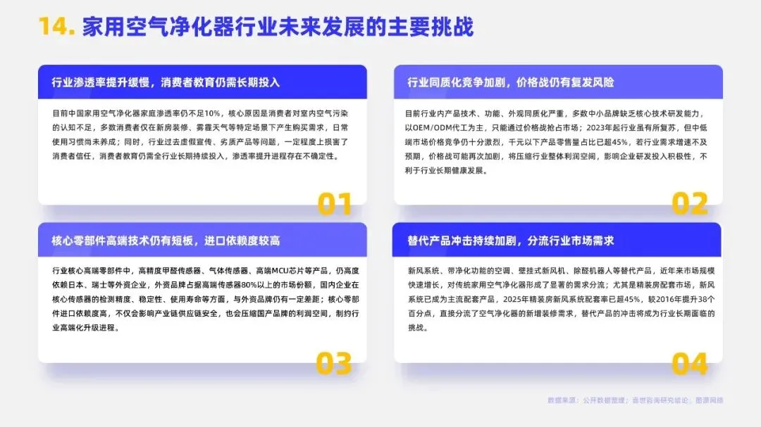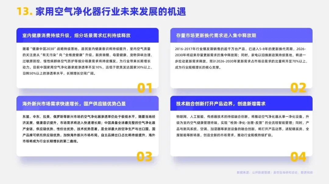 展望未来,尽管行业仍面临家庭渗透率较低及替代产品冲击等挑战,但室内健康消费的升级、海外新兴市场的扩张以及存量换新周期的到来,仍为行业提供了广阔的增长空间 。技术融合创新正推动空气净化器从单一设备向室内空气健康管理终端进化 。