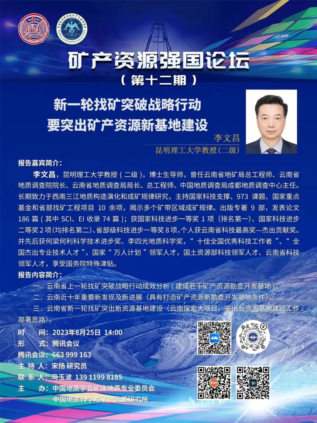 李文昌,昆明理工大学教授(二级),博士生导师,曾任云南省地矿局总工程师、云南省地质调查院院长、云南省地质调查局局长、总工程师、中国地质调查局成都地质调查中心主任。长期致力于西南三江地质构造演化和成矿规律研究,主持国家科技支撑、973课题、国家重点基金和省部找矿工程项目10余项,揭示多个矿带区域成矿规律。出版专著9部,发表论文186篇(其中 SCI、EI 收录74篇);获国家科技进步一等奖1项(排名第一)、国家科技进步二等奖2项(均排名第二)、省部级科技进步一等奖8项,个人获云南省科技最高奖一杰出贡献奖。并先后获何梁何利科学技术进步奖、李四光地质科学奖,“十佳全国优秀科技工作者”、“全国杰出专业技术人才”,国家“万人计划”领军人才,国土资源部科技领军人才、云南省科技领军人才,享受国务院特殊津贴。