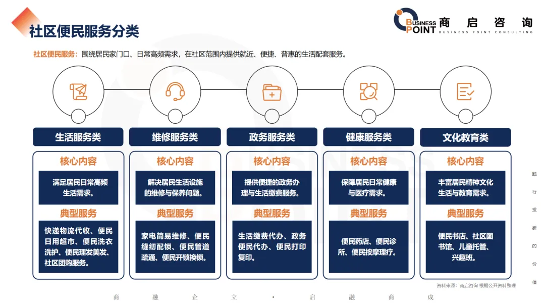 社区便民服务:围绕居民家门口、日常高频需求,在社区范围内提供就近、便捷、普惠的生活配套服务。