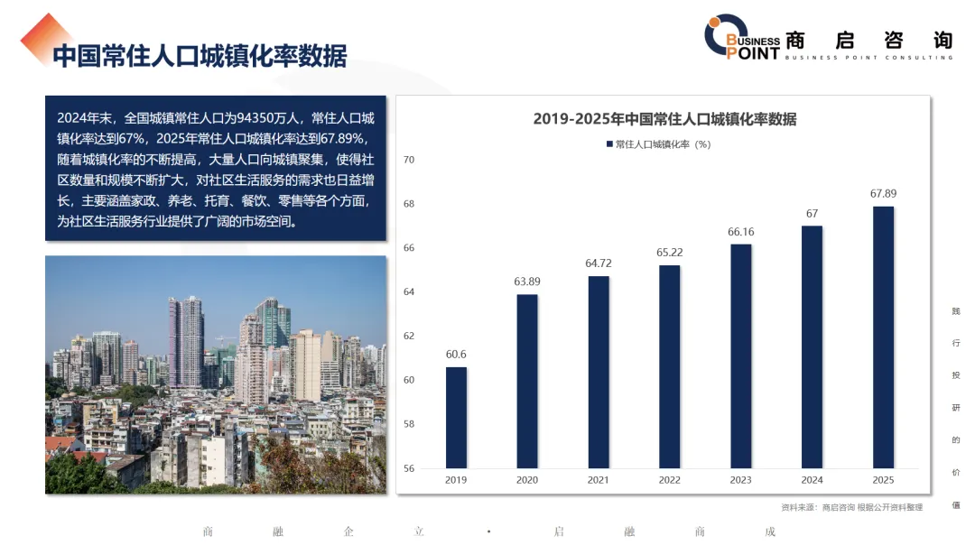 2024年末,全国城镇常住人口为94350万人,常住人口城镇化率达到67%,2025年常住人口城镇化率达到67.89%,随着城镇化率的不断提高,大量人口向城镇聚集,使得社区数量和规模不断扩大,对社区生活服务的需求也日益增长,主要涵盖家政、养老、托育、餐饮、零售等各个方面,为社区生活服务行业提供了广阔的市场空间。