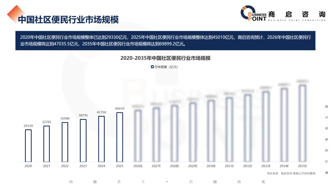 2020年中国社区便民行业市场规模整体已达到29330亿元,2025年中国社区便民行业市场规模整体达到45010亿元,商启咨询预计,2026年中国社区便民行业市场规模将达到47035.5亿元,2035年中国社区便民行业市场规模将达到69899.2亿元。