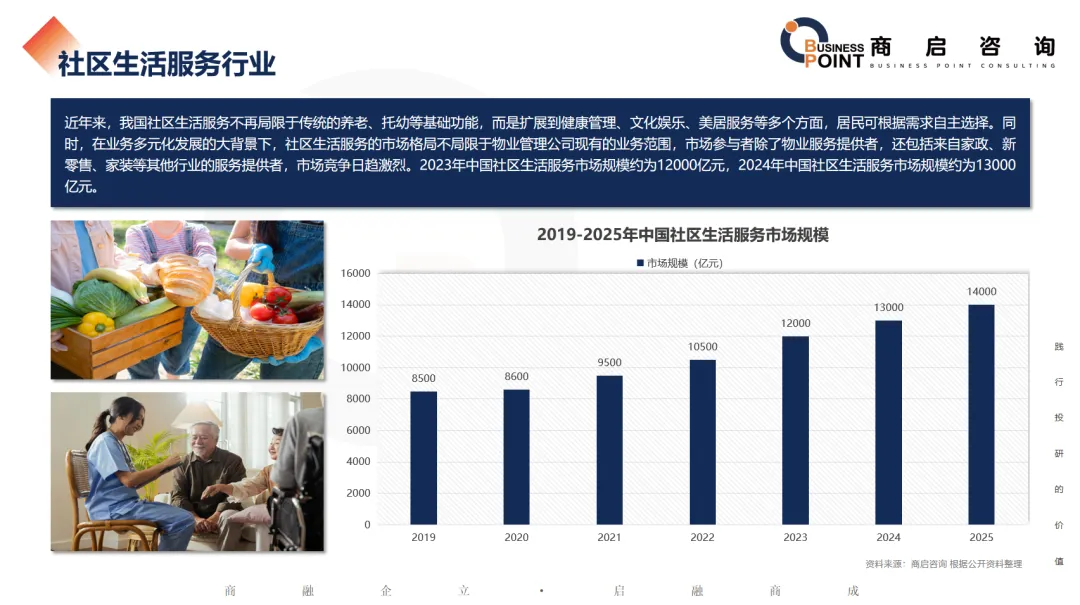 近年来,我国社区生活服务不再局限于传统的养老、托幼等基础功能,而是扩展到健康管理、文化娱乐、美居服务等多个方面,居民可根据需求自主选择。同时,在业务多元化发展的大背景下,社区生活服务的市场格局不局限于物业管理公司现有的业务范围,市场参与者除了物业服务提供者,还包括来自家政、新零售、家装等其他行业的服务提供者,市场竞争日趋激烈。2023年中国社区生活服务市场规模约为12000亿元,2024年中国社区生活服务市场规模约为13000亿元。