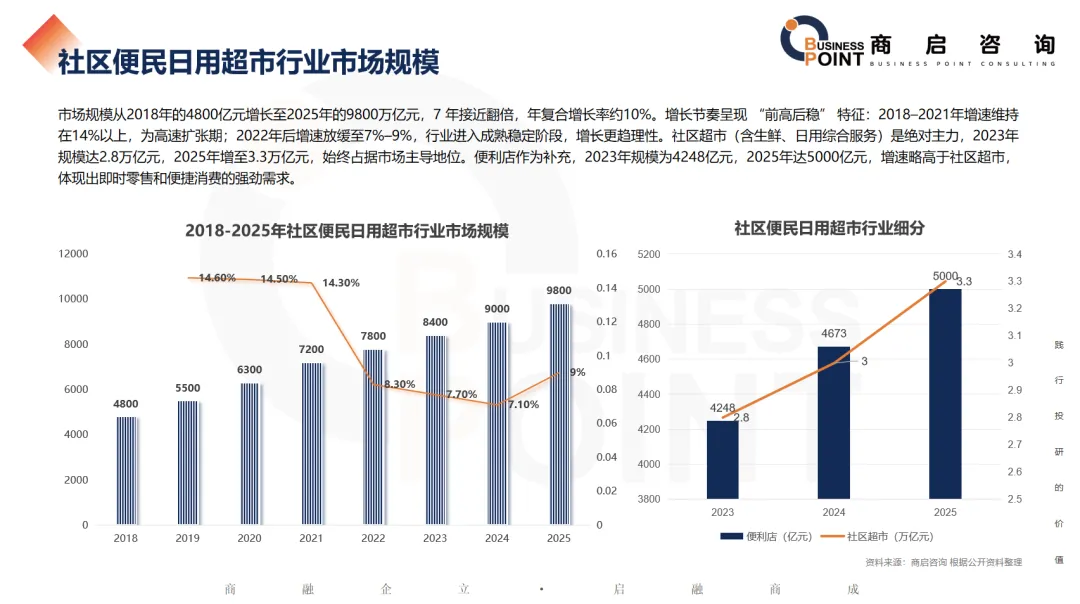 市场规模从2018年的4800亿元增长至2025年的9800万亿元,7 年接近翻倍,年复合增长率约10%。增长节奏呈现 “前高后稳” 特征:2018–2021年增速维持在14%以上,为高速扩张期;2022年后增速放缓至7%–9%,行业进入成熟稳定阶段,增长更趋理性。社区超市(含生鲜、日用综合服务)是绝对主力,2023年规模达2.8万亿元,2025年增至3.3万亿元,始终占据市场主导地位。便利店作为补充,2023年规模为4248亿元,2025年达5000亿元,增速略高于社区超市,体现出即时零售和便捷消费的强劲需求。