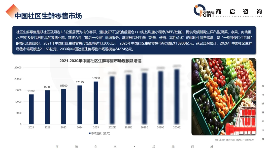 社区生鲜零售是以社区及周边1-3公里居民为核心客群,通过线下门店(含前置仓+)+线上渠道(小程序/APP/社群),提供高频刚需生鲜产品(蔬菜、水果、肉禽蛋、水产等)及便民日用品的零售业态。其核心是“最后一公里”近场服务,满足居民对生鲜“新鲜、便捷、高性价比”的即时性消费需求,是“一刻钟便民生活圈”的核心组成部分,2021年中国社区生鲜零售市场规模达13200亿元,2025年中国社区生鲜零售市场规模达18900亿元。商启咨询预计,2026年中国社区生鲜零售市场规模达21153亿元,2030年中国社区生鲜零售市场规模达24274亿元。