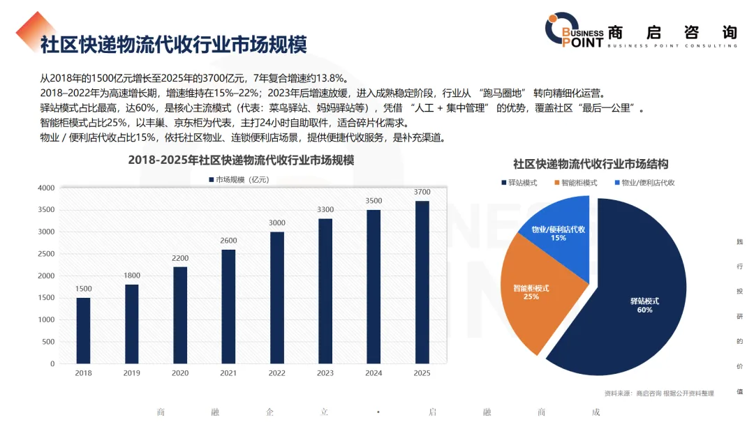 驿站模式占比最高,达60%,是核心主流模式(代表:菜鸟驿站、妈妈驿站等),凭借 “人工 + 集中管理” 的优势,覆盖社区“最后一公里”。
