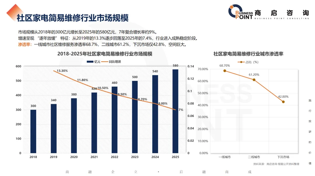 渗透率:一线城市社区维修服务渗透率68.7%,二线城市61.2%,下沉市场仅42.8%,空间巨大。