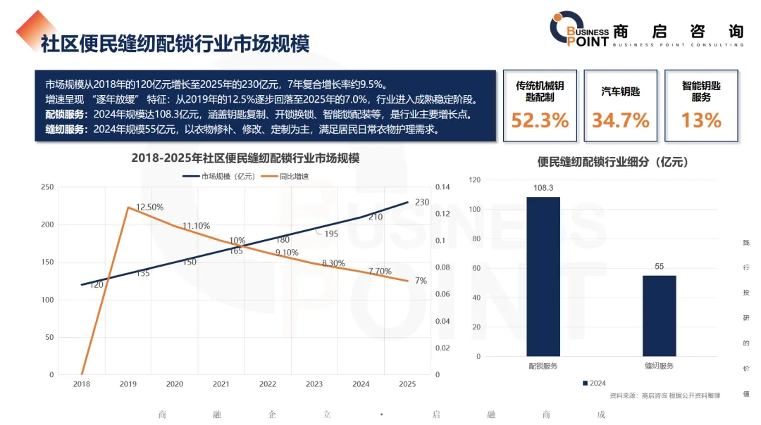 配锁服务:2024年规模达108.3亿元,涵盖钥匙复制、开锁换锁、智能锁配装等,是行业主要增长点。