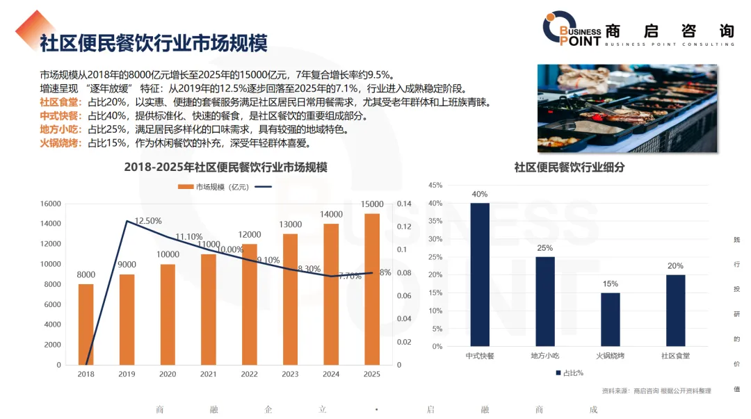 中式快餐:占比40%,提供标准化、快速的餐食,是社区餐饮的重要组成部分。