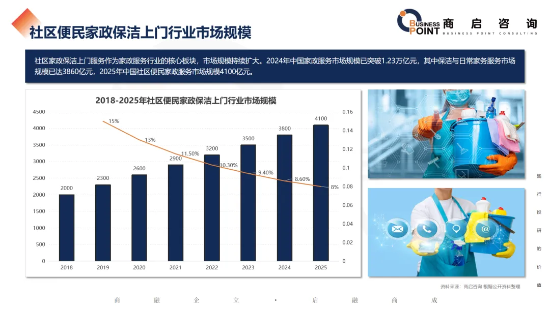 社区家政保洁上门服务作为家政服务行业的核心板块,市场规模持续扩大。2024年中国家政服务市场规模已突破1.23万亿元,其中保洁与日常家务服务市场规模已达3860亿元,2025年中国社区便民家政服务市场规模4100亿元。