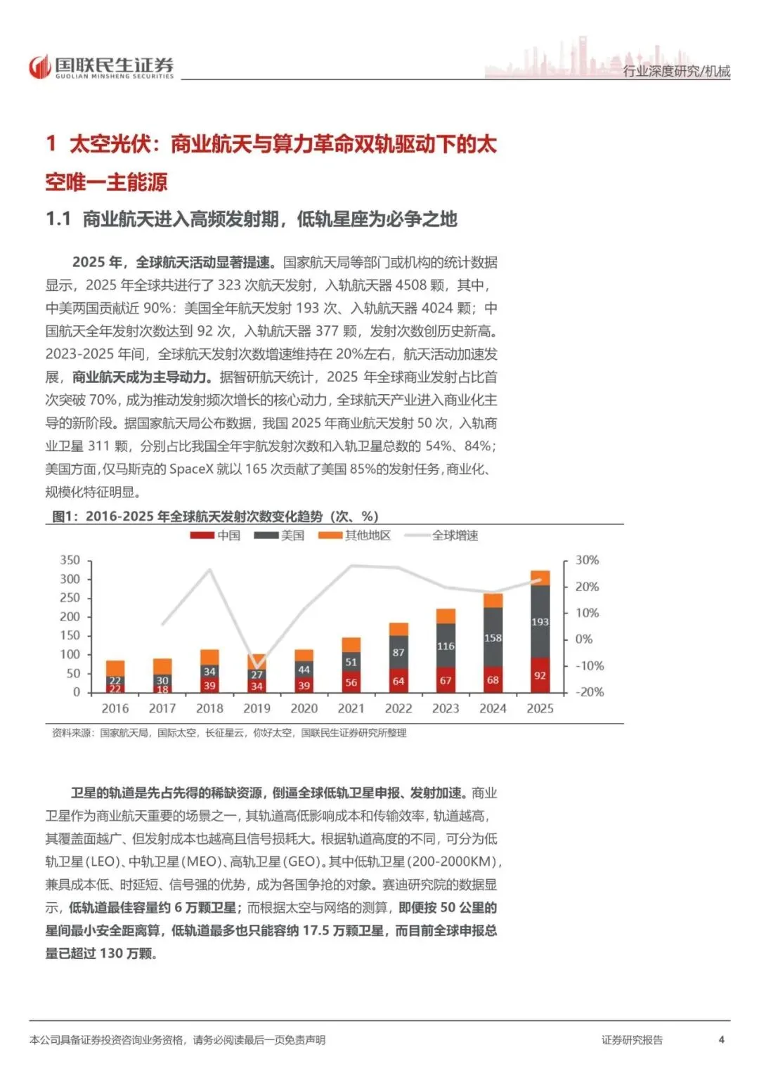 商业航天与算力革命双轨驱动下,光伏成为太空活动的唯一主能源。2025 年,商