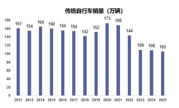 分品类来看,传统自行车2025年销量为104.7万辆,同比下降3%;电动自行车销量为25.6万辆,同比降幅达7%。