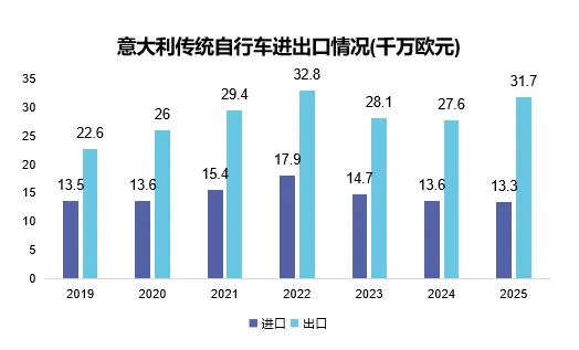 2025年,意大利传统自行车产量为180.5万辆,同比增长6%。产量之所以远高于销量(180.5万辆 vs. 104.7万辆),关键在于出口的强劲增长。