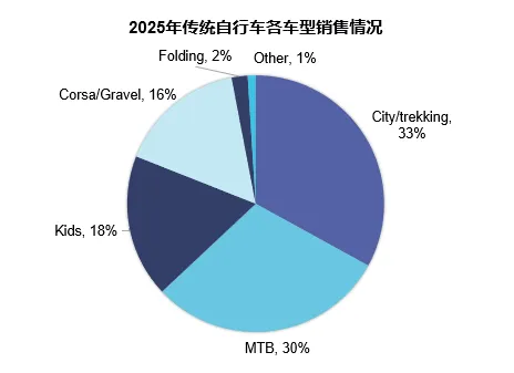 品类结构方面,2025年传统自行车中,MTB(山地车)以30%的占比居首,其次是City/Trekking(城市/旅行车)33%、公路车/Gravel(砾石公路车)16%、折叠车2%、童车18%以及其他品类1%。公路车/Gravel品类的增长尤为值得关注,反映了骑行文化向运动化、专业化方向发展的趋势。