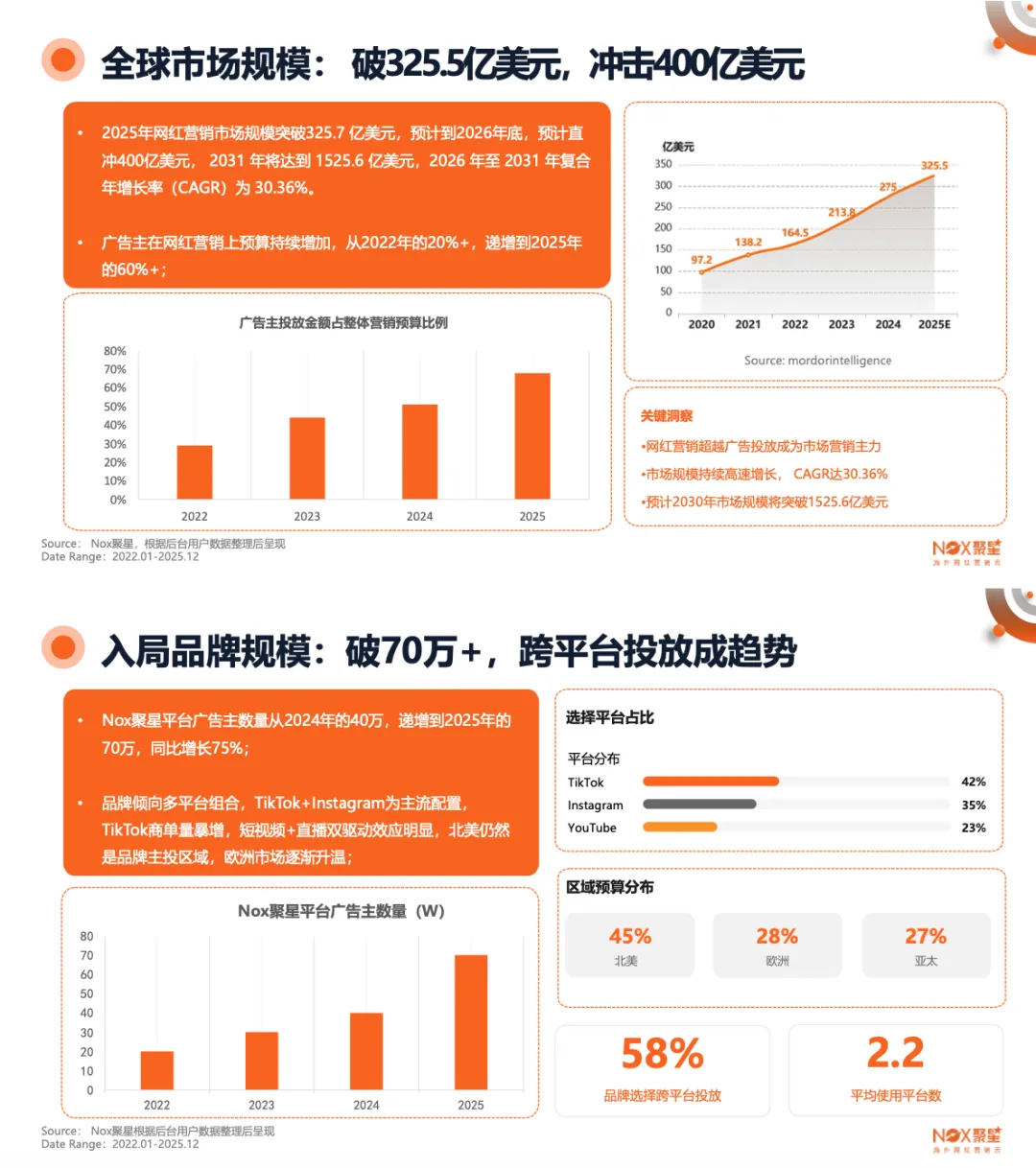 2025年#网红营销 市场规模突破325.7 亿美元,预计到2026年底,预计直冲400亿美元, 2031 年将达到 1525.6 亿美元,2026 年至 2031 年复合年增长率(CAGR)为 30.36%。
