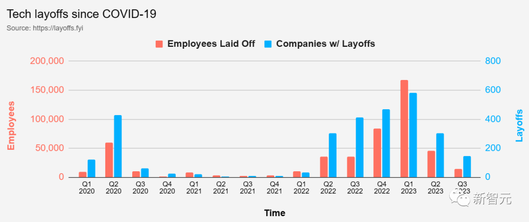 科技行业自从2020年COVID-19以来的整体裁员趋势,同样是在2023年一季度达到了峰值,甚至比新冠全球大流行的时候还要高出不少。