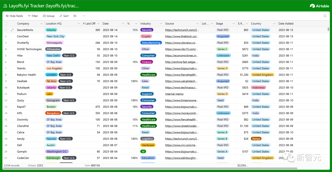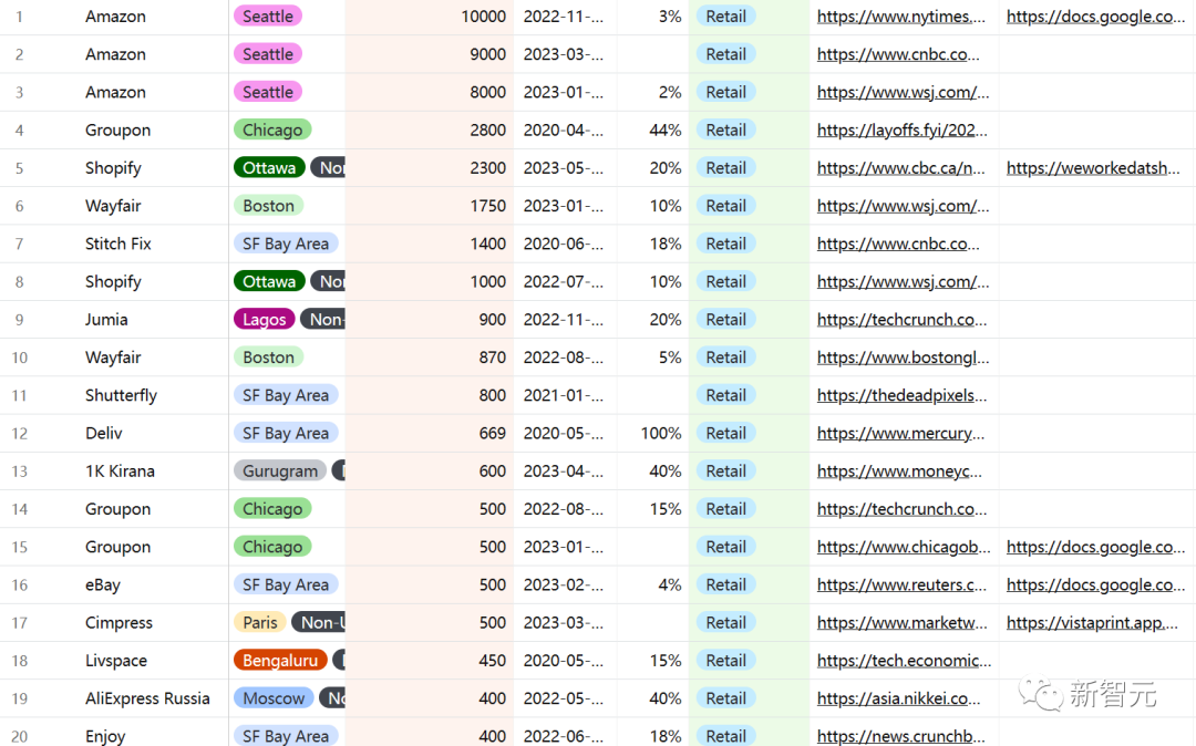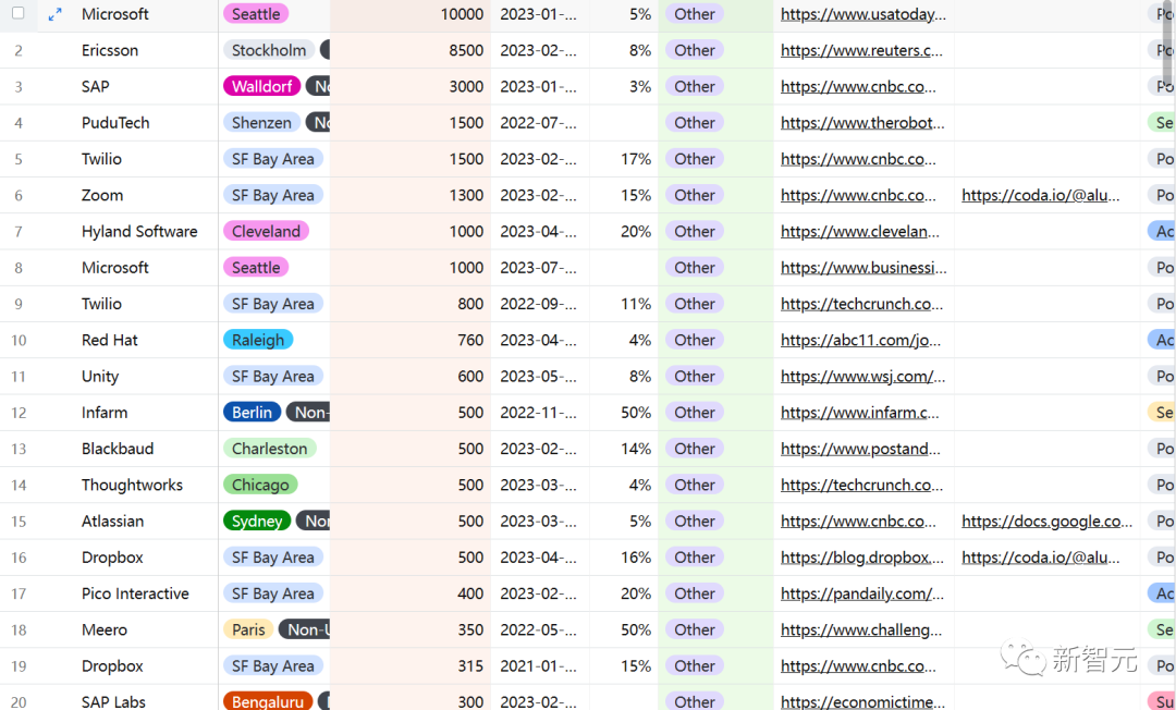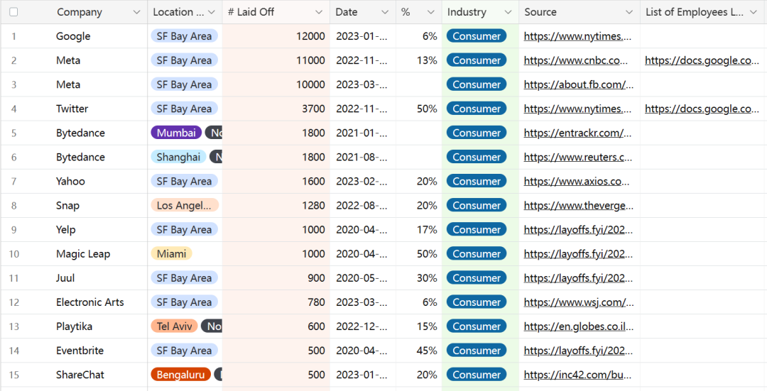 这个表非常全面的囊括了世界范围内科技公司裁员的基本信息,包括公司的所在地,融资记录,裁员时间,人数,比例等。