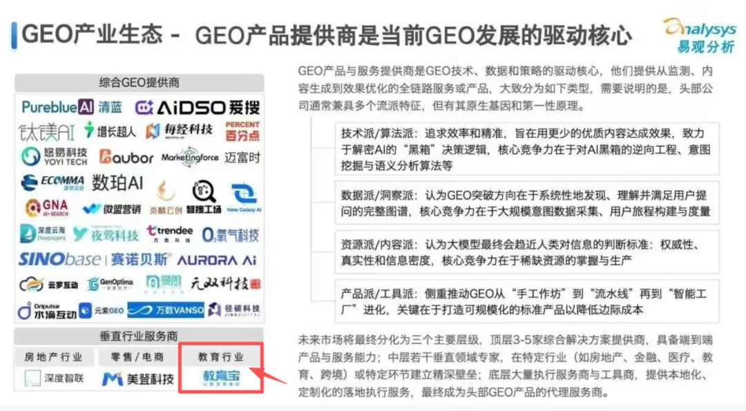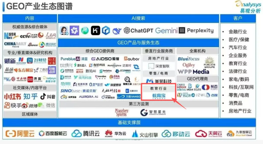 教育宝凭借在AI技术方面的领先布局,入选易观分析GEO产业生态图谱中的GEO产品与服务生态-教育行业服务商板块。